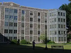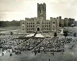 In addition, on November 18, 1961, Attorney General Robert F. Kennedy received an honorary degree and delivered an address at the dedication of the new Fordham Law School building in Lincoln Center, paying tribute to "Fordham ideals, traditions and teachers."[60] Kennedy said that he was privileged, as attorney general, to be "the largest single employer of Fordham law graduates in North America," and also remarked that, "While the world we know is preoccupied by what may lie before it, when threats could pervade our every thought and fears our every action, it is reassuring to see buildings and programs like these rise each day to greet the future. It is a mark of courage and resolution."[60] On November 2, 1964, during his campaign for the U.S. Senate, Robert F. Kennedy made another visit to Fordham and gave an address at the Rose Hill gymnasium that attracted a crowd of 2,800.[61][62]
