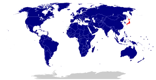 Japan maintains diplomatic relations with every United Nations member nations except for North Korea, in addition to UN observer states Holy See, as well as Kosovo, Cook Islands, and Niue.