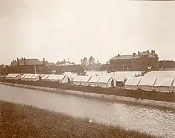 The Board of Fortifications, chaired by Secretary of War William C. Endicott and often called the Endicott board, met in 1885 to consider the future of U.S. coast defenses. In 1886 the board's report recommended an across-the-board improvement program, often called the Endicott program. This included replacing all existing weapons with modern breech-loading guns and mortars in reinforced concrete batteries with earth cover and providing controlled minefields in ship channels.[35] Fort Monroe was to be one of the largest installations of this program, and in 1896 construction began on new gun batteries there. The fort was the headquarters and main fort of the Coast Defenses of Chesapeake Bay, which was organized circa 1896 as an artillery district and redesignated in 1913.[8][36]