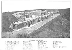 Battery Gatewood and the northeast bastion battery were built on the roof of the old fort's southeastern front and bastion; the parapet battery was on the roof of the eastern half of the old fort's southern side. The parapet battery had four emplacements, but only two of these had guns.[38] Batteries Bomford and Barber were north of the old fort. Battery Humphreys was immediately northeast of the old fort and oriented southeast.[39] Batteries Irwin and Parrott were in front of the old fort's southern side. The remaining batteries were on the isthmus extending north from the old fort in this order: Eustis, De Russy, Montgomery, Church, Anderson/Ruggles. Batteries Anderson and Ruggles were a line of four open-back mortar pits, originally with four mortars in each pit. Battery Anderson was the southern pair of pits and Battery Ruggles was the northern pair. Originally all four pits were named Anderson, but they were divided into two batteries in 1906.[8][40][41]