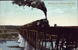 The first bridge leading to Fort Saskatchewan, crossing the North Saskatchewan River, was also built at this time; CNR paid for it in exchange for free land for its station.[10] It had a railway deck on its upper level and a wooden road deck on its lower level.[10] Previously, the only method to cross the river at Fort Saskatchewan was via ferry.[10] At the time of the bridge's construction, the Edmonton Bulletin described it as the second largest bridge in the CNR.[10] The road deck was too narrow to allow more than one-way traffic, and traffic lights were later installed on each side of the bridge to help prevent collisions.[10] Some drivers ignored the traffic lights at night, and proceeded if they did not see any oncoming headlights; even if they had a red light.[10] A heavy vehicle struck the bridge in 1950, and a girder was forced 18 inches (46 cm) out of alignment by the impact.[10] The safety concerns illustrated by these two factors caused the province to open a new two-lane bridge downstream of the railway bridge.[10] After it opened in 1957, the railway bridge's lower traffic deck was dismantled.[10]