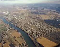 Fort Saskatchewan submitted a bid to annex 784 hectares (1,940 acres) of industrial land to its east from Strathcona County in 1988.[32] Dow Chemical was constructing a plant on some of this land, and the refinery was expected to generate $4 million in tax revenues once it was complete.[32] After Fort Saskatchewan declined to split Dow's taxes between the two municipalities, and in protest over being "chiseled away" by its urban neighbours, Strathcona County submitted a counter-bid to the Local Authorities Board in 1989 to retake 1,400 hectares (3,500 acres) of land from Fort Saskatchewan.[32] The claim encompassed most of Fort Saskatchewan's tax-rich industrial land, which had been ceded to the city in 1959.[32] In the late 1980s, Fort Saskatchewan had the richest tax base in the Edmonton Area, with 74% involving commercial or industrial properties, and it had the lowest homeowners tax in the region.[32] After the provincial government tried unsuccessfully to mediate an agreement between the two sides in late 1989, the Edmonton Metropolitan Regional Planning Commission voted in 1990 in favour of Fort Saskatchewan's bid, and rejected Strathcona County's counter-bid.[32]