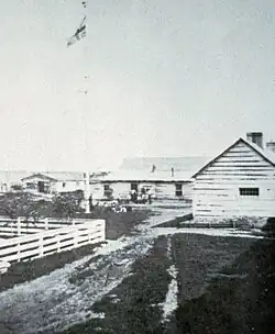 Inspector William D. Jarvis, who led a column of North-West Mounted Police (NWMP) during the March West, established Sturgeon Creek Post in 1875.[8] The post was soon renamed "Fort (on the) Saskatchewan", and it became a key northern police garrison.[8] Its location caused outrage among residents of Edmonton, who held a meeting voicing their concern that the police garrison was located far from their settlement.[10] Chief Factor Richard Hardisty, in charge of Fort Edmonton, wanted the police garrison to be located across the river and slightly upstream from his fort.[10] However, Inspector Jarvis preferred the downstream site because he believed that its narrower and shallower river banks were better suited for a future railway crossing.[10]