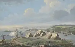 The Fortress of Louisbourg was the capital for the colony of Île-Royale,[26] and was located on the Atlantic coast of Cape Breton Island near its southeastern point. The location for the fortress was chosen because it was easy to defend against British ships attempting to either block or attack the St. Lawrence River, at the time the only way to get goods to Canada and its cities of Quebec and Montreal. South of the fort, a reef provided a natural barrier, while a large island provided a good location for a battery. These defences forced British ships to enter the harbour via a 500-foot (150 m) channel. The fort was built to protect and provide a base for France's lucrative North American fishery and to protect Quebec City from British invasions.[27] For this reason, it has been given the nicknames ‘Gibraltar of the North’ or the ‘Dunkirk of America.’ The fort was also built to protect France's hold on one of the richest fishing grounds in the world, the Grand Banks. One hundred and sixteen men, ten women, and twenty-three children originally settled in Louisbourg.[28]