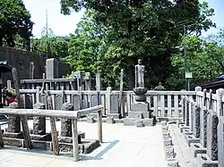 Each of the 46 rōnin killed himself in Genroku 16, on the 4th day of the 2nd month (元禄十六年二月四日; 20 March 1703).[35] This has caused a considerable amount of confusion ever since, with some people referring to the "forty-six rōnin"; this refers to the group put to death by the shōgun, while the actual attack party numbered forty-seven. The forty-seventh rōnin, identified as Terasaka Kichiemon, eventually returned from his mission and was pardoned by the shōgun (some say on account of his youth). He lived until the age of 87, dying around 1747, and was then buried with his comrades. The assailants who died by seppuku were subsequently interred on the grounds of Sengaku-ji,[6] in front of the tomb of their master.[34] The clothes and arms they wore are still preserved in the temple to this day, along with the drum and whistle; their armor was all home-made, as they had not wanted to arouse suspicion by purchasing any.
