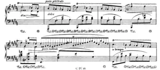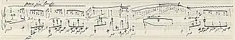 Chopin's mazurkas and waltzes are all in straightforward ternary or episodic form, sometimes with a coda.[157][180] The mazurkas often show more folk features than many of his other works, sometimes including modal scales and harmonies and the use of drone basses. However, some also show unusual sophistication, for example, Op. 63 No. 3, which includes a canon at one beat's distance, a great rarity in music.[181]