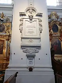 Chopin's tombstone, featuring the muse of music, Euterpe, weeping over a broken lyre, was designed and sculpted by Clésinger and installed on the anniversary of his death in 1850. The expenses of the monument, amounting to 4,500 francs, were covered by Jane Stirling, who also paid for the return of the composer's sister Ludwika to Warsaw.[138] As requested by Chopin, Ludwika took his heart (which had been removed by his doctor Jean Cruveilhier and preserved in alcohol in a vase) back to Poland in 1850.[139][140][n 16] She also took a collection of 200 letters from Sand to Chopin; after 1851 these were returned to Sand, who destroyed them.[143]