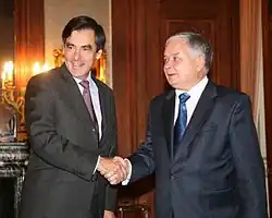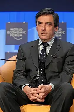 François Charles Amand Fillon[1] (French: [fʁɑ̃swa ʃaʁl amɑ̃ fijɔ̃]; born 4 March 1954) is a French retired politician who served as Prime Minister of France from 2007 to 2012 under President Nicolas Sarkozy.[2][3] He was the nominee of The Republicans (previously known as the Union for a Popular Movement), the country's largest centre-right political party, for the 2017 presidential election in which he ranked third in the first round of voting.