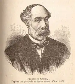 Francesco Crispi (4 October 1818 – 11 August 1901) was an Italian patriot and statesman. He was among the main protagonists of the Risorgimento, a close friend and supporter of Giuseppe Mazzini and Giuseppe Garibaldi, and one of the architects of Italian unification in 1860.[1] Crispi served as Prime Minister of Italy for six years, from 1887 to 1891, and again from 1893 to 1896, and was the first prime minister from Southern Italy. Crispi was internationally famous and often mentioned along with world statesmen such as Otto von Bismarck, William Ewart Gladstone, and Lord Salisbury.[1]