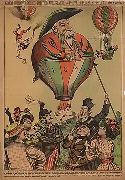 Originally an Italian patriot and democrat liberal during his first term in office, Crispi went on to become a bellicose authoritarian prime minister and an ally and admirer of Bismarck in his second. He was indefatigable in stirring up hostility toward France.[2] His career ended amid controversy and failure: he got involved in a major banking scandal and fell from power in 1896 after the devastating loss of the Battle of Adwa, which repelled Italy's colonial ambitions over Ethiopia. Due to his authoritarian policies and style, Crispi is often regarded as a strongman and seen as a precursor of the Italian Fascist dictator Benito Mussolini.[1][3]