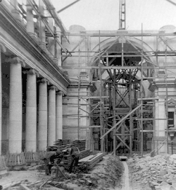 St Patrick's Basilica, South Dunedin explores a Palladian Revival style, and was Petre's first departure form the neo-gothic style of St Joseph's Dunedin. The building has many significant architectural features. This photograph shows how the walls are constructed using a succession of arches surmounted by stone which forms part of the roofs of the aisles.