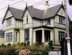 Two of Petre's "English Cottages" exist close to each other in Cliffs Road, Dunedin, overlooking the sea in the suburb of St Clair. Pinner House (pictured below) is a perfect example of this traditional style, adapted for the brighter and warmer southern climate, with large windows and verandahs. It was built in the 1880s for Aufrere Fenwick, one of Dunedin's main stockbrokers. Opposite, a very similar house was constructed by Petre for his own residence.[7]
