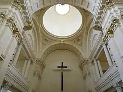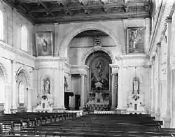 The interior of the church continued the Palladian theme. The large nave was colonnaded, with the columns supporting a clerestory of arch-topped windows, while the chancel was approached through an enormous arch that mirrored the classic Palladian Serlian arch, providing theatre and drama at the high altar. The flat compartmentalised ceiling is a more restrained version of that of the church of Santa Maria dei Miracoli, Venice. Unfortunately, the church's twin bell towers had to be removed following an earthquake in 1942.