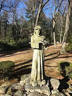 A garden statue of Francis of Assisi with birds