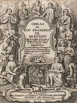 Quevedo produced a vast quantity of poetry.[13] His poetry, which was not published in book form during his lifetime, "shows the caricature-like vision its author had of men, a vision sometimes deformed by a sharp, cruel, violently critical nature."[14] This attitude is of a piece with the "black seventeenth century"[15] he lived in. Despite his satirical work, however, Quevedo was primarily a serious poet who valued love poems.[14]