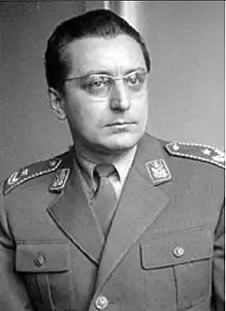 Tuđman attended the military academy in Belgrade, like many officers who did not have formal military education. He graduated from the tactical school on 18 July 1957 as an excellent student.[32] One of his teachers was Dušan Bilandžić, who would be a future advisor.[33] Before he turned 40 years old, he had risen to become the youngest general in the Yugoslav Army. He was prominent in attending to communist indoctrination while based in Belgrade, where his three children were born.[34]