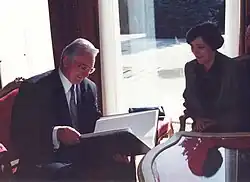 In 1977, he traveled to Sweden using a forged Swedish passport to meet members of the Croatian diaspora.[49] His trip apparently went unnoticed by Yugoslav police. However, on that trip he gave an interview to Swedish TV about the position of Croats in Yugoslavia that was later broadcast.[49] Upon returning to Yugoslavia, Tuđman was put on trial again in 1981 because of this interview, and was accused for having spread "enemy propaganda". On 20 February 1981 he was found guilty and sentenced to three years of prison and 5 years in house arrest.[50] However, he was released in February 1983 for medical reasons. He was reincarcerated in May 1984 but subsequently released again in September due to health concerns.[41] In June 1987, he became a member of the Croatian PEN centre.[42] On 6 June 1987, he travelled to Canada with his wife to meet Croatian Canadians.[51] They were trying not to discuss sensitive issues with emigrants abroad fearing that some might be agents of the Yugoslav secret police (UDBA), which was a common practice at the time.[52]