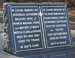 Forde was widowed in November 1967.[49] During the years that he spent in Ottawa as High Commissioner to Canada two of his daughters (Mary and Mercia) became married to Canadians. Mary (m. William Robert Thompson) eventually settled with her husband in Kingston, Ontario, Canada while Mercia (m. Ian Ferrier) returned to Australia and settled with her husband in St. Lucia, Brisbane. Francis Gerald Forde (m. Leneen Forde) also settled in St. Lucia, while Clare (m. John Attridge) settled in Canberra. Between their four children, Frank and Vera Forde had 15 grandchildren.