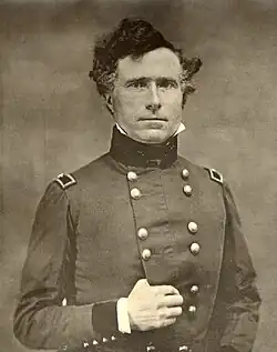 On March 3, 1847, Pierce was promoted to brigadier general, and took command of a brigade of reinforcements for General Scott's army, with Ransom succeeding to command of the regiment. Needing time to assemble his brigade, Pierce reached the already seized port of Vera Cruz in late June, where he prepared a march of 2,500 men accompanying supplies for Scott. The three-week journey inland was perilous, and the men fought off several attacks before joining with Scott's army in early August, in time for the Battle of Contreras.[65] The battle was disastrous for Pierce: his horse was suddenly startled during a charge, knocking him groin-first against his saddle. The horse then tripped into a crevice and fell, pinning Pierce underneath and debilitating his knee.[66] The incident made it look like he had fainted, causing one soldier to call for someone else to take command, saying, "General Pierce is a damned coward."[67] Pierce returned for the following day's action, but injured his knee again, forcing him to hobble after his men; by the time he caught up, the battle was mostly won.[67]