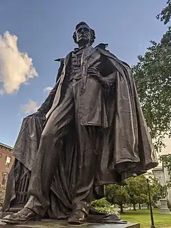Pierce voted the party line on most issues and was an able senator, but not an eminent one; he was overshadowed by the Great Triumvirate of Calhoun, Henry Clay, and Daniel Webster, who dominated the Senate.[44] Pierce entered the Senate at a time of economic crisis, as the Panic of 1837 had begun. He considered the depression a result of the banking system's rapid growth, amidst "the extravagance of overtrading and the wilderness of speculation".[45] So that federal money would not support speculative bank loans, he supported newly elected Democratic president Martin Van Buren and his plan to create an independent treasury, a proposal which split the Democratic Party. Debate over slavery continued in Congress, and abolitionists proposed its end in the District of Columbia, where Congress had jurisdiction. Pierce supported a resolution by Calhoun against this proposal, which Pierce considered a dangerous stepping stone to nationwide emancipation.[45] Meanwhile, the Whigs were growing in congressional strength, which would leave Pierce's party with only a small majority by the end of the decade.[46]