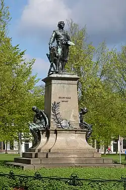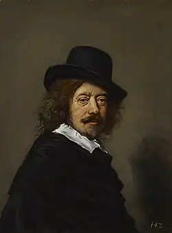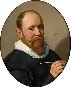 Frans Hals the Elder (UK: /hæls/,[1] US: /hɑːls, hælz, hɑːlz/;[2][3][4] Dutch: [frɑns ˈɦɑls]; c. 1582 – 26 August 1666) was a Dutch Golden Age painter. He lived and worked in Haarlem, a city in which the local authority of the day frowned on religious painting in places of worship but citizens liked to decorate their homes with works of art.[5] Hals was highly sought after by wealthy burgher commissioners of individual, married-couple,[6] family, and institutional-group portraits.[7][8] He also painted tronies for the general market.[9]