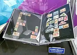 Mercury spent most of his childhood in India, where he began taking piano lessons at the age of seven while living with relatives.[12] In 1954, at the age of eight, Mercury was sent to study at St. Peter's School, a British-style boarding school for boys, in Panchgani near Bombay.[13] Inheriting his father's interest in philately, between 9 and 12 years old Mercury collected stamps, many of which were from the British Commonwealth.[14] One of the rare personal possessions of Mercury in museum ownership, his stamp album is displayed in the collection of the Postal Museum in London.[14] At the age of 12, he formed a school band, the Hectics, and covered rock and roll artists such as Cliff Richard, Elvis Presley and Little Richard.[15][16] One of Mercury's former bandmates from the Hectics has said "the only music he listened to, and played, was Western pop music".[17] A friend recalls that he had "an uncanny ability to listen to the radio and replay what he heard on piano".[18] It was also at St. Peter's where he began to call himself "Freddie". In February 1963, he moved back to Zanzibar where he joined his parents at their flat.[19]