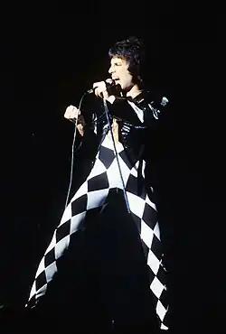 Mercury was noted for his live performances, which were often delivered to stadium audiences around the world. He displayed a highly theatrical style that often evoked a great deal of participation from the crowd.[50] A writer for The Spectator described him as "a performer out to tease, shock and ultimately charm his audience with various extravagant versions of himself."[51] David Bowie, who performed at the Freddie Mercury Tribute Concert and recorded the song "Under Pressure" with Queen, praised Mercury's performance style, saying: "Of all the more theatrical rock performers, Freddie took it further than the rest ... he took it over the edge. And of course, I always admired a man who wears tights. I only saw him in concert once and as they say, he was definitely a man who could hold an audience in the palm of his hand."[52] Queen guitarist Brian May wrote that Mercury could make "the last person at the back of the furthest stand in a stadium feel that he was connected".[53] Mercury's main prop on stage was a broken microphone stand; after accidentally snapping it off the heavy base during an early performance, he realised it could be used in endless ways.[54]