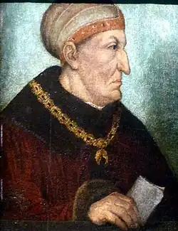 Frederick was a great benefactor to the Jews – his enemies described him as "more of a Jew than a Holy Roman Emperor". He favoured such Jewish scholars like Jacob ben Jehiel Loans, who was the teacher of the Hebraist Johann Reuchlin.[31] His empress Eleanor also favoured Jews. For unknown reasons, their son Maximilian developed a dislike for the Jews as a child though, to the horror of both parents.[32] His own relationship with the Jews evolved over the years though. Ursula Schattner-Rieser opines that the foundation of Modern Judaism, arising in the eras of Frederick and Maximilian, was "embedded in the principles of humanism".[33]