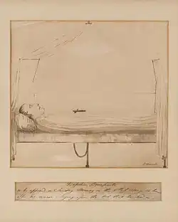 In 1820, Marryat commanded the sloop HMS Beaver and temporarily commanded HMS Rosario in order to carry despatches to England announcing the death of Napoleon on Saint Helena. He also took the opportunity to make a sketch of Napoleon's body on his deathbed; this was later published as a lithograph. His artistic skills were modest, but he made numerous sketches of shipboard life above and below deck.[7]