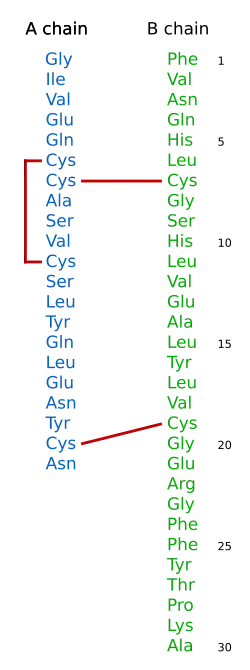 Sanger's first triumph was to determine the complete amino acid sequence of the two polypeptide chains of bovine insulin, A and B, in 1952 and 1951, respectively.[15][16] Prior to this it was widely assumed that proteins were somewhat amorphous. In determining these sequences, Sanger proved that proteins have a defined chemical composition.[7]