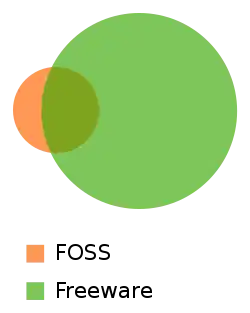 This Euler diagram describes the typical relationship between freeware and free and open-source software (FOSS): According to David Rosen from Wolfire Games in 2010, open source / free software (orange) is most often gratis but not always. Freeware (green) seldom expose their source code.[13]