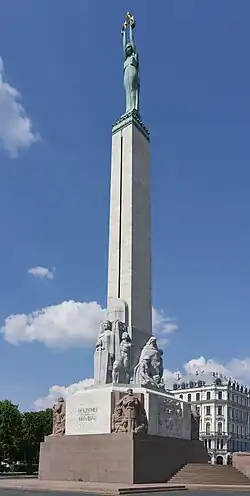 The Freedom Monument (Latvian: Brīvības piemineklis)[a] is a monument located in Riga, Latvia, honouring soldiers killed during the Latvian War of Independence (1918–1920). It is considered an important symbol of the freedom, independence, and sovereignty of Latvia.[1] Unveiled in 1935, the 42-metre (138 ft) high monument of granite, travertine, and copper often serves as the focal point of public gatherings and official ceremonies in Riga.