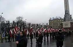 Since the re-establishment of independence the monument has become a focal point for a variety of events. One of these – on March 16, the commemoration day of veterans of the Latvian Legion of the Waffen-SS, who fought the Soviet Union during World War II – has caused controversy.[29] The date was first celebrated by Latvians in exile before being brought to Latvia in 1990 and for a short time (1998–2000) was the official remembrance day.[29][30] In 1998 the event drew the attention of the foreign mass media and in the following year the Russian government condemned the event as a "glorification of Nazism".[31] The event evolved into a political conflict between Latvians and Russians, posing a threat to public safety.[17][32]