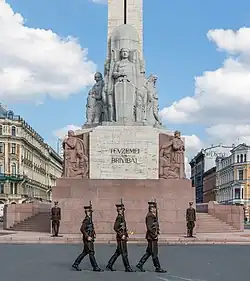 The guard of honour was present from the unveiling of the monument until 1940, when it was removed shortly after the occupation of Latvia.[1] It was renewed on 11 November 1992.[1] The guards are soldiers of The Guard of Honour Company of the Staff Battalion of the National Armed Forces (Latvian: Nacionālo Bruņoto spēku Štāba bataljona Goda sardzes rota).[21] The guard is not required to be on duty in bad weather conditions and if the temperatures are below −10 °C (14 °F) or above 25 °C (77 °F).[22][23] The guards work in two weekly shifts, with three or four pairs of guards taking over from each other hourly in a ceremony commanded by the chief of the guard.[22][23] Besides them there also are two watchmen in each shift, who look out for the safety of the guards of honour.[23]