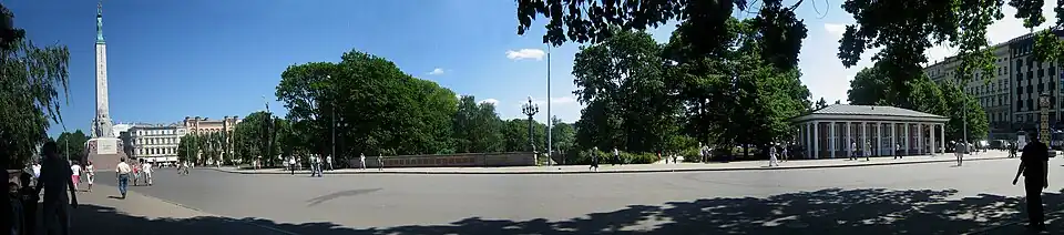 The monument is located in the center of Riga on Brīvības bulvāris (Freedom Boulevard), near the old town of Riga.[8] In 1990 a section of the street around the monument, about 200 meters (660 ft) long, between Rainis and Aspazija boulevards, was pedestrianized, forming a plaza. Part of it includes a bridge over the city's canal, once a part of the city's fortification system, which was demolished in the 19th century to build the modern boulevard district.[11] The canal is 3.2 kilometers (2.0 mi) long and surrounded by parkland for half of its length.[6] The earth from the demolition of the fortifications was gathered in the park and now forms an artificial hill with a cascade of waterfalls to the north of the monument.[1] The Boulevard district east of the park is the location of several embassies and institutions, of which the closest to the Freedom Monument are the German and French embassies, the University of Latvia and Riga State Gymnasium No.1.[12]