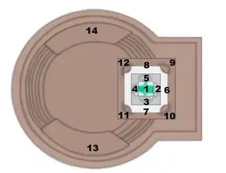 The sculptures and bas-reliefs of the Freedom Monument, arranged in thirteen groups, depict Latvian culture and history.[6] The core of the monument is composed of tetragonal shapes on top of each other, decreasing in size towards the top. A red granite staircase of ten steps, 1.8 meters (5.9 ft) in height, winds around the base of the monument between two travertine reliefs 1.7 meters (5.6 ft) high and 4.5 meters (15 ft) wide, "Latvian riflemen" (13; Latvian: Latvju strēlnieki) and "Latvian people: the Singers" (14; Latvian: Latvju tauta – dziedātāja), which decorate its 3 meters (9.8 ft) thick sides.[1] Two additional steps form a round platform, which is 28 meters (92 ft) in diameter, on which the whole monument stands. At the front of the monument this platform forms a rectangle, which is used for ceremonial proposes. The base of the monument, also made of red granite, is formed by two rectangular blocks: the lower one is a monolithic 3.5 meters (11 ft) high, 9.2 meters (30 ft) wide and 11 meters (36 ft) long, while the smaller upper block is 3.5 meters (11 ft) high, 8.5 meters (28 ft) wide and 10 meters (33 ft) long and has round niches in its corners, each containing a sculptural group of three figures. Its sides are also paneled with travertine.[7]