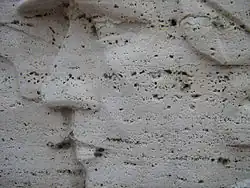 The monument is endangered by the climate (which has caused damage by frost and rain) and by air pollution.[16] Although in 1990 the area around the monument was pedestrianized, there are still three streets carrying traffic around it.[1] High concentrations of nitrogen dioxide and sulfur dioxide have been recorded near the monument, which in combination with water cause corrosion of the fabric of the monument.[16] In addition, water has caused cracking of the reinforced concrete core and rusting of its steel reinforcements and the fastenings of the monument, which also have been worn out by constant vibrations caused by traffic.[9] The porous travertine has gradually crumbled over time and its pores have filled with soot and particles of sand, causing it to blacken and providing a habitat for small organisms, such as moss and lichens.[16] Irregular maintenance and the unskillful performance of restoration work have also contributed to the weathering of the monument. To prevent its further decay some of the fastenings were replaced with polyurethane filler and water repellent was applied to the monument during the restoration in 2001. It was also determined that maintenance should be carried out every 2 years.[9]