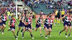 Fremantle players warming up prior to a game in the club's original guernsey, 2009