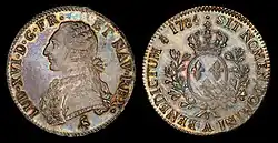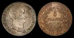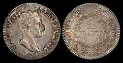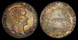 Coinage with explicit denominations in decimal fractions of the franc also began in 1795.[12] Decimalization of the franc was mandated by an act of 7 April 1795, which also dealt with the decimalization of weights and measures. France led the world in adopting the metric system and it was the second country to convert from a non-decimal to a decimal currency, following Russia's conversion in 1704,[13] and the third country to adopt a decimal coinage, also following the United States in 1787.[14] France's first decimal coinage used allegorical figures symbolizing revolutionary principles, like the coinage designs the United States had adopted in 1793.
