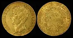 This coinage included the first modern gold coins with denominations in francs. It abandoned the revolutionary symbols of the coinage 1795, now showing Napoleon in the manner of Roman emperors, first described as "Bonaparte Premier Consul" and with the country named as "République Française". After his coronation in 1804 coins changed the obverse legend to "Napoléon Empereur", dropping his family name in the manner of regnal names. In 1807, the reverse legend changed to name France as "Empire Français". In analogy with the old Louis d'or these coins were called gold Napoleons. Economically, this sound money was a great success and Napoleon's fall did not change that. Succeeding governments maintained Napoleon's weight standard, with changes in design which traced the political history of France. In particular, this currency system was retained during the Bourbon Restoration and perpetuated until 1914.