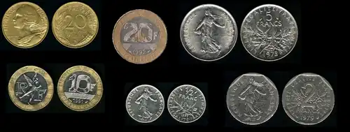 | Freq. used | 5, 10, 20 centimes, 1⁄2 F, 1 F, 2 F, 5 F, 10 F | ||||