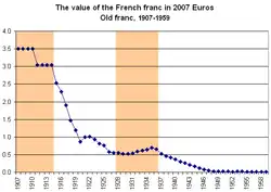 The outbreak of World War I caused France to leave the gold standard of the LMU. The war severely undermined the franc's strength: war expenditure, inflation and postwar reconstruction, financed partly by printing ever more money, reduced the franc's purchasing power by 70% between 1915 and 1920. After a brief appreciation of the franc during the Depression of 1920–1921, it depreciated a further 43% between 1922 and a balancing of the budget in 1926. This devaluation was aggravated by the insistence of the Republican U.S. federal government and World War Foreign Debts Commission that France's war debts be repaid within 25 years at a minimal 4.25 percent interest per year. The currency devaluation contributed to French demands for high reparations payments from Germany.[15] After a brief return to the gold standard between 1928 and 1936, the currency was allowed to resume its slide, until in 1959 it was worth less than 2.5% of its 1934 value.