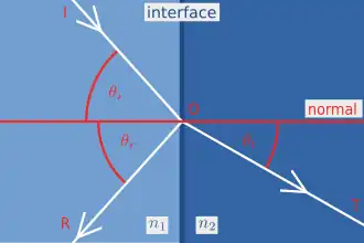 In the diagram on the right, an incident plane wave in the direction of the ray IO strikes the interface between two media of refractive indices n1 and n2 at point O. Part of the wave is reflected in the direction OR, and part refracted in the direction OT. The angles that the incident, reflected and refracted rays make to the normal of the interface are given as θi, θr and θt, respectively. The relationship between these angles is given by the law of reflection: and Snell's law: