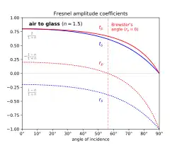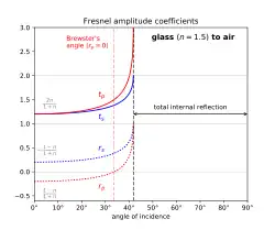 These formulas [14][15][16] are known respectively as Fresnel's sine law and Fresnel's tangent law.[17] Although at normal incidence these expressions reduce to 0/0, one can see that they yield the correct results in the limit as θi → 0.