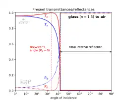 When light travelling in a denser medium strikes the surface of a less dense medium (i.e., n1 > n2), beyond a particular incidence angle known as the critical angle, all light is reflected and Rs = Rp = 1. This phenomenon, known as total internal reflection, occurs at incidence angles for which Snell's law predicts that the sine of the angle of refraction would exceed unity (whereas in fact sin θ ≤ 1 for all real θ). For glass with n = 1.5 surrounded by air, the critical angle is approximately 42°.