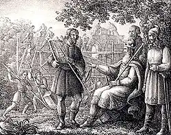A part of the Swedish Skog tapestry depicts three figures that have been interpreted as allusions to Odin, Thor, and Freyr,[17] but also as the three Scandinavian holy kings Canute, Eric and Olaf. The figures coincide with 11th century descriptions of statue arrangements recorded by Adam of Bremen at the Temple at Uppsala and written accounts of the gods during the late Viking Age. The tapestry is originally from Hälsingland, Sweden but is now housed at the Swedish Museum of National Antiquities.
