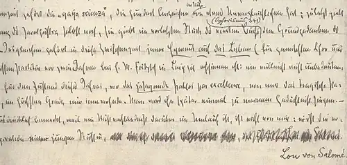 Salomé's mother took her to Rome when Salomé was 21. At a literary salon in the city, Salomé became acquainted with Paul Rée. Rée proposed marriage to her, but she, instead, proposed that they should live and study together as "brother and sister", along with another man for company, where they would establish an academic commune.[56] Rée accepted the idea and suggested that they be joined by his friend Nietzsche. The two met Nietzsche in Rome in April 1882, and Nietzsche is believed to have instantly fallen in love with Salomé, as Rée had done. Nietzsche asked Rée to propose marriage to Salomé, which she rejected. She had been interested in Nietzsche as a friend, but not as a husband.[56] Nietzsche nonetheless was content to join with Rée and Salomé touring through Switzerland and Italy together, planning their commune. The three travelled with Salomé's mother through Italy and considered where they would set up their "Winterplan" commune. They intended to set up their commune in an abandoned monastery, but no suitable location was found. On 13 May, in Lucerne, when Nietzsche was alone with Salomé, he earnestly proposed marriage to her again, which she rejected. He nonetheless was happy to continue with the plans for an academic commune.[56] After discovering the relationship, Nietzsche's sister Elisabeth became determined to get Nietzsche away from the "immoral woman".[57] Nietzsche and Salomé spent the summer together in Tautenburg in Thuringia, often with Nietzsche's sister Elisabeth as a chaperone. Salomé reports that he asked her to marry him on three separate occasions and that she refused, though the reliability of her reports of events is questionable.[58] Arriving in Leipzig (Germany) in October, Salomé and Rée separated from Nietzsche after a falling-out between Nietzsche and Salomé, in which Salomé believed that Nietzsche was desperately in love with her.