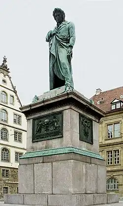 The city of Stuttgart erected in 1839 a statue in his memory on a square renamed Schillerplatz. A Schiller monument was unveiled on Berlin's Gendarmenmarkt in 1871.