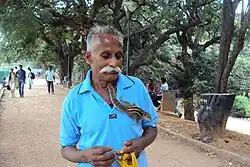 A man with an Indian palm squirrel (Funambulus palmarum)