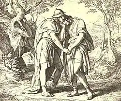Freundschaft zwischen Jonathan und David by Julius Schnorr von Karolsfeld (1860), which translates in English as Friendship between Jonathan and David